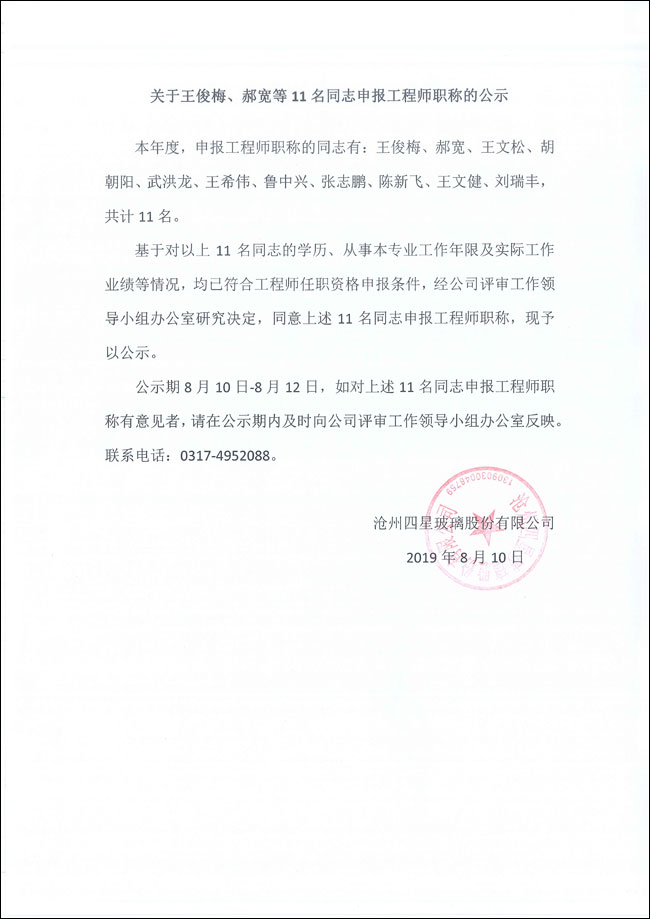 關(guān)于王俊梅、郝寬等11名同志申報(bào)工程師職稱(chēng)的公示